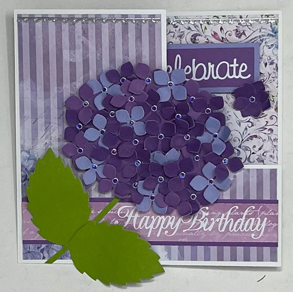 4. Die cut a stem and two leaves from green cardstock and glue them to the front as shown. Foam tape the hydrangea flower to the front, letting it extend over the inside back as shown. Place jewel Dazzles™ in the blossom centers.
