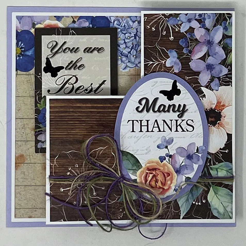 5. Trace and cut the inside paper pattern from Country Blooms tan paper with flowers along the top and glue it centered on the remaining panel. Cut out the “you are the best” greeting and wrap purple and green jute across it near the bottom, gluing the ends to the back. Foam tape the greeting to the panel near the upper edge.