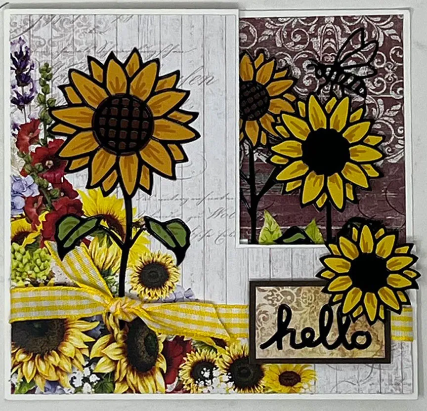 2. For the front: Download, trace and cut the front paper pattern from Sunflowers white boards cardstock with the flowers in the lower left corner. Wrap yellow gingham ribbon across the cardstock, ¾" from the bottom, and glue the ends to the back. Tie a 4" ribbon onto the first ribbon, 1½" from the left edge, then glue the cardstock centered on the front panel.