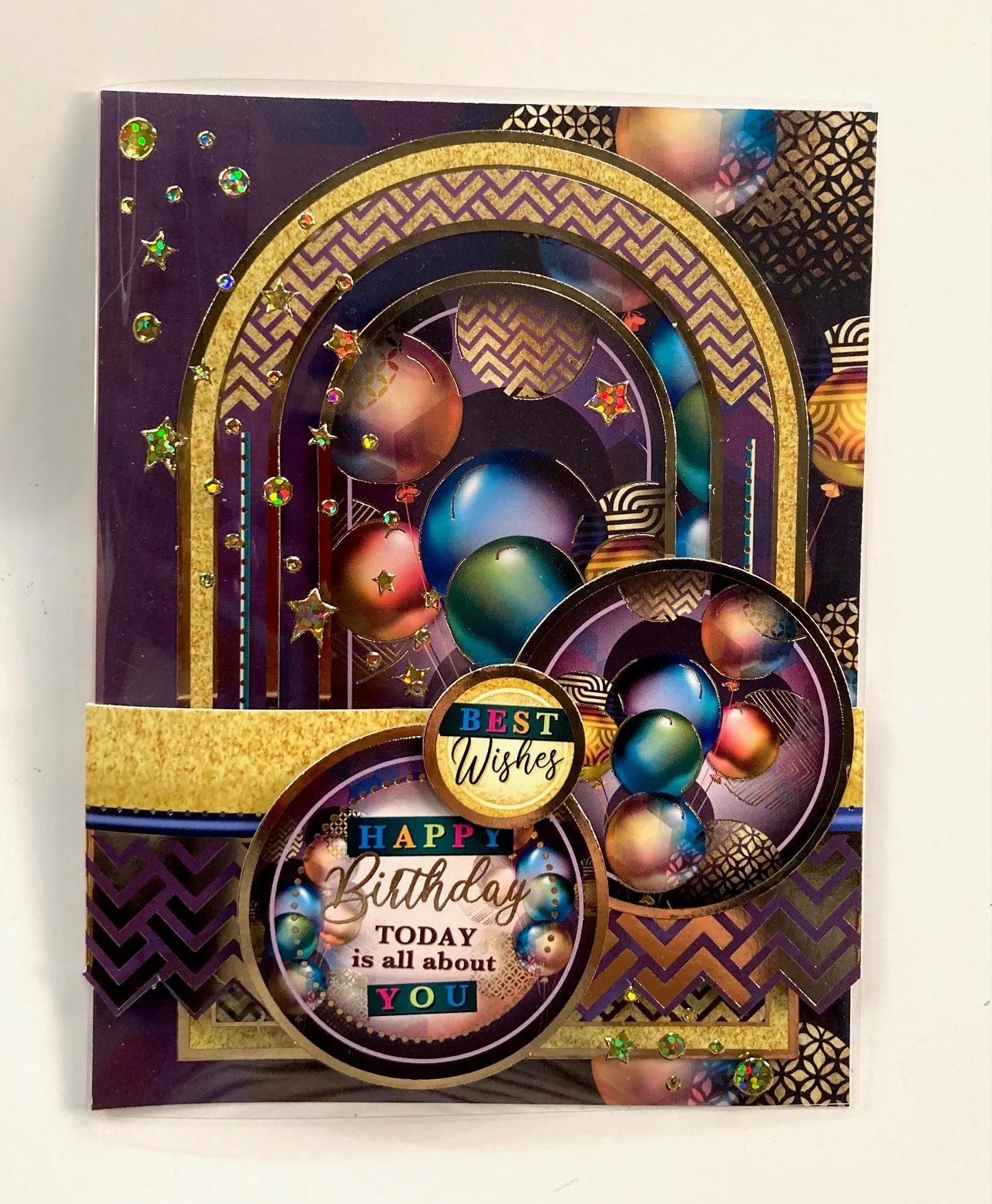 Card front: Fussy cut around the zig zag foiled balloon border piece. Use extra sticky tape to secure to the acetate 1" from the bottom and a circle balloon on top. Foam tape the birthday circle topper and “Best Wishes” topper. Starting at the top left corner place gold Jewel Dazzles™️ and gold Star Dazzles™️ cascading down to the bottom right corner avoiding the border area.