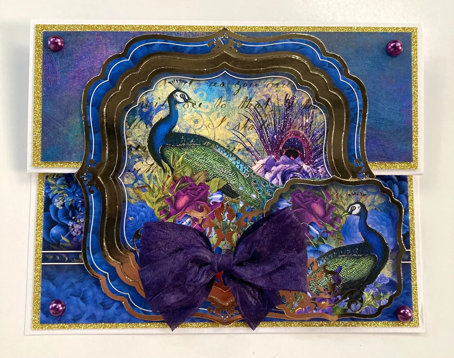Card front: Cut a piece of gold glitter cardstock to 6 1/4"x2 1/4" and glue it to the front panel leaving a 1/16" white border. Cut a 2 1/8"x6" piece of the printed Adorable Scorable from the "Born to Stand Out" collection and use Extra Sticky Tape to attach it to the gold glitter cardstock leaving a 1/8" gold border. Select the large square Topper and separate the outer two frames from the inner image. Glue the two frames onto a piece of white cardstock and trim out to reinforce the Topper. Double foam tape the middle image back into the center. Place extra sticky tape along only the top of the large topper and attach to the center of the card top. Foam tape the small peacock square Topper to the bottom right. Make and Zot™️ a 3" wide purple bow as shown and place a purple pearl Diamond Sparkle in the top left and right corners.