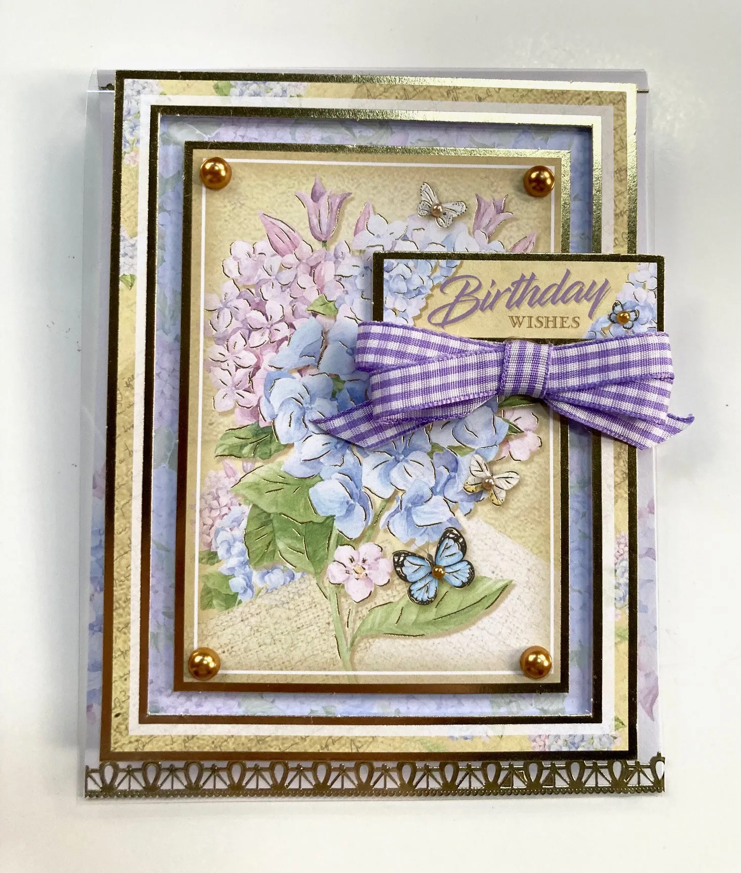 To cover the works on the back of the card front cut the other insert with the hydrangea bouquet to 4 1/2"x5 7/8" and place over the exposed card front piece on the inside of the card using extra sticky tape. With the tape runner place the border Topper 1" from top. Secure the hydrangea definition Topper with the tape runner over it as shown. Zot™️ a 1" gingham knot between them as shown. Place brown pearl Diamond Sparkles in the butterflies. Cut a 5"x1/2" strip of the hydrangea Adorable Scorable from the front to cover the folded over acetate on the back of the card.