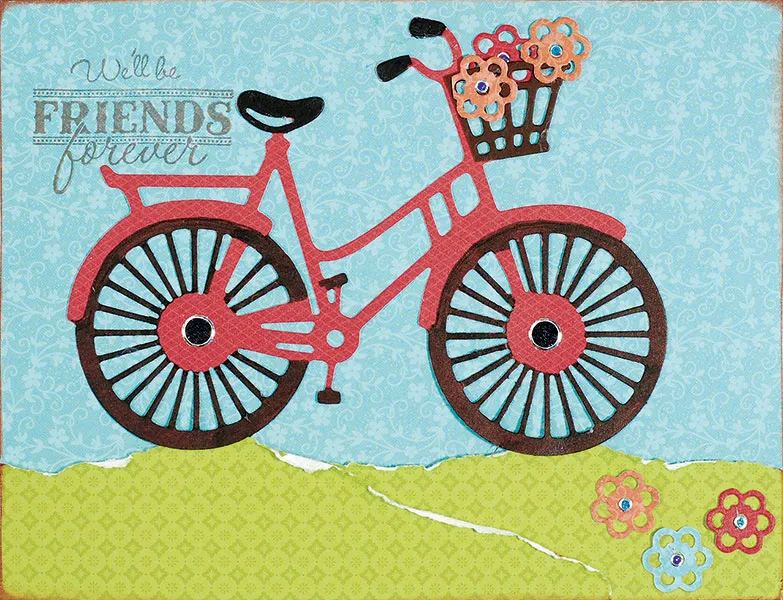 Place Black Jewel Dazzles™ at the center of each bike wheel. Die cut Pretty Little Posies orange, red and blue flowers. Glue three flowers in the bike basket and three at the bottom right corner. Embellish flower centers with Purple and Teal Jewel Dazzles™. Stamp “We’ll Be Friends…” Heart to Heart Stamp on the left as shown.