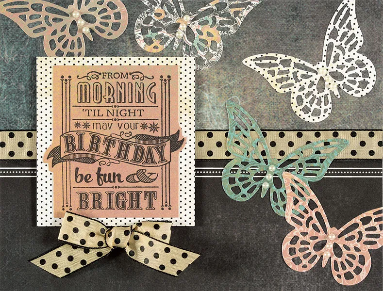 Following your die cutting machine manufacturer’s instructions, die cut 5 butterflies in various light colors as shown. Glue them to the card as shown, trimming off excess. Apply 3 small adhesive pearls to the body of each butterfly.