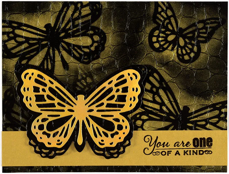 Following your die cutting machine manufacturer’s instructions, die cut 5 butterflies in various light colors as shown. Glue them to the card as shown, trimming off excess. Apply 3 small adhesive pearls to the body of each butterfly.