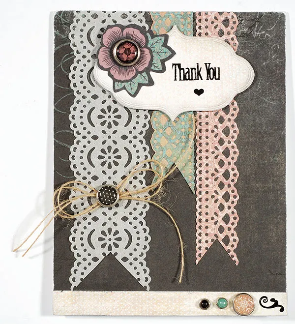 Use your finger to apply a small amount of black decorating chalk on the embossed edges of the 3 1/2" scalloped label die-cut. Foam tape centered on the card, overlapping the border die-cuts, 3/8” from the top. Glue/foam tape the Embellies™ flower/brad on the left side of the label. Place “Thank You” and heart Dazzles™ on the right side of the label.