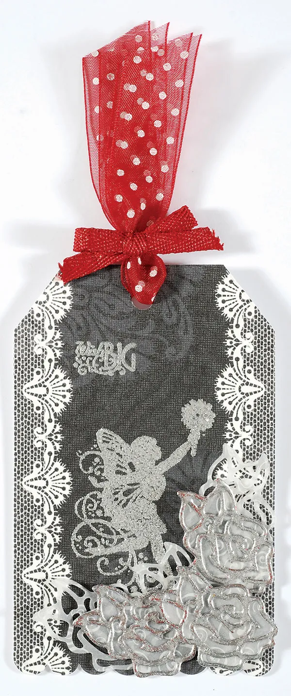 Use VersaMark™ to stamp a fairy on the center of a 3”x4 3/4” tag, and “Wish BIG” on the upper left corner. Dust with Silver Zing! embossing powder and use the heat gun to set.