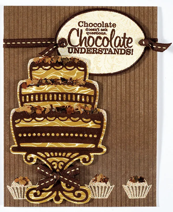 TECHNIQUE: CHOCOLATE CAKE Follow your die cutting machine manufacturer’s instructions to cut one cake die-cut from Moka suede paper. Place the cutting die on the back of the gold ripple holographic paper, trace around the outer edge of the die and cut out along the traced line. Glue the suede cake onto the front of the cutout, with a 1/16” border. Swipe the top edge and corners of the matted cake with VersaMark&trade,; dust with Golden Sand embossing powder and heat set. Apply tacky glue to the tops of the cake layers and place Tea Stained mica flakes on the glue. Let dry. Foam tape 1/8” from the left and bottom edges.