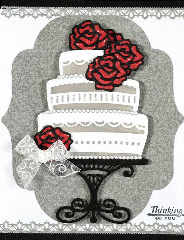 Die cut cake from black cardstock. Cut cake off leaving only the cake stand. Foam tape cake stand centered ¼” from bottom. Foam tape embossed cake onto cake stand. Place White Jewel Dazzles™ in a row to the bottom edge of each layer of cake. Die cut 8 roses from black cardstock, and cut off leaves. Glue to Robin’s Red red patterned paper and trim. Glue roses to cake as shown. Tie bow from Robin’s Red white swirl ribbon, and Zot™ to bottom left of cake.