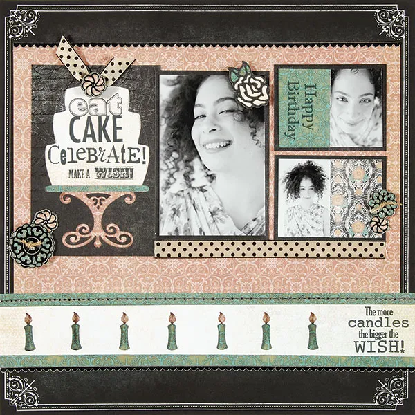 Embellishments: Tie a bow with Chalkboard ivory/black polka dot ribbon, and Zot™ to top of the cake. Zot 6 5/8” of ribbon under photos as shown. Place Black Jewel Border Dazzles™ on the bottom of the 12” Chalkboard teal paper, the top of the 12” teal paper, as well as the top of the Chalkboard pink patterned paper. Place Button Dazzles™ onto Chalkboard pink, and teal patterned papers. Cut out and thread the buttons with Chalkboard natural twine. Glue to layout as shown.