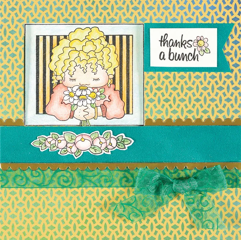 For the front: Place your card with the fold on the top. Cut it down to a 5" square. Cover the card front with yellow pattern paper. Stamp the girl frame on white cardstock with black StazOn®. Color in with watercolor pencils. I left mine dry but you can use water if desired. Cut out the girl frame. Place on the card 1/2" from the top and right and trace around it with a pencil. Remove the image. Open the card flat on your cutting mat and cut the rectangle you traced, creating a window. Erase any pencil lines showing. Stamp and color in "Thanks a bunch" on white cardstock and cut out. Glue it centered to a 1 3/4"x1" piece of suede. Cut a shallow V in the right end and glue to the right side of the window as shown. Glue 5"x3/4" of suede paper across the card directly beneath the window. Glue 5" of sheer swirl ribbon across the card just below the suede. Place brass Jewel Border Dazzles above and below the suede, trimming to fit. Glue a sheer bow to the right side of the ribbon as shown. Stamp and color in a garland of flowers and cut out, leaving a 1/16" white border. Glue beneath the window on the suede strip.
