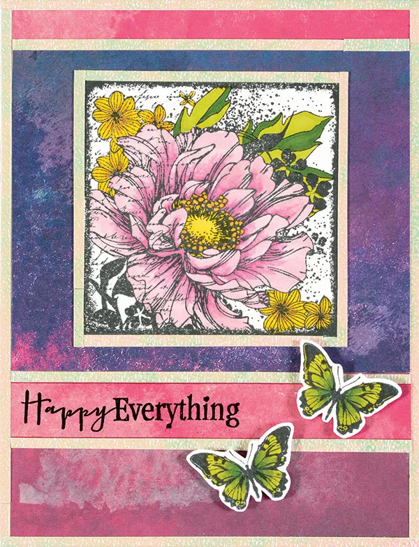 For the front: Place your card with the fold on the left. Cover the card with dark purple watercolor paper. Glue 5"x1/2" pink paper across the top. Glue 5"x1 1/4" dark pink paper across the bottom. Cut 5"x3/4" of pink paper and stamp and emboss "Happy Everything" on the left side. Glue to card 1 1/4" from the bottom. Cut 4 long 1/8" wide strips of white textured iridescent paper. Apply strips of double sided adhesive to the back and place these strips along all 4 edges of the card and between the different colors of paper as shown. Trim any excess. Stamp large botanical frame on white cardstock with Tuxedo Black Memento™ dye ink pad. Color in with Spectrum Noir™ Pens PP5, PP3, CT4, GB5, CG2, and DG3. Cut out and glue to the center of the purple section. Glue narrow iridescent strips framing the image, trimming to fit. Color in and cut out 2 butterflies and foam tape them as shown.
