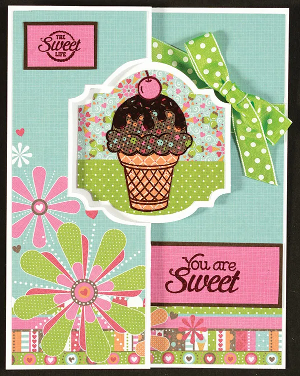 For the inside: Cover the spine with pink circles and cut out a blue inside (larger) label. Cover the bottom 1" of the label with green hearts, trimming to fit. Glue to the inside label on the card. Create an ice cream cone identical to the front except with white dot ice cream and glue it to the right side of the label as shown. Cut 3"x1" of pink paper and cut a V in the left. Stamp and emboss "You are Sweet" (found on Janie's Girl Frames stamps) in the center. Mat on brown cardstock with a 1/16" border and glue to card 1 1/4" from the bottom. Glue green dot ribbon across the back panel 1 1/2" from the top. Close the card and glue a green dot bow to the upper right of the label as shown.