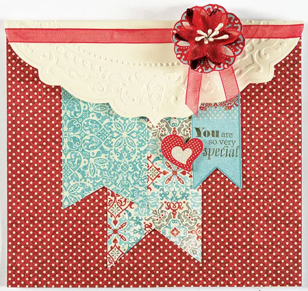 Card Front: Place your card with the fold at the top and cut 1” off of one end of the card side. Cover the card with Robin’s Red red dot paper. Cut a “V” shape into the bottom of both Robin’s Red 1¾”x4½” aqua/red tapestry and 1 5/8”x3½” aqua tile papers. Glue flush with the card top with one down the center of the card and one overlapping the first strip, on the left. Stamp Heartfelt Greetings “ You Are So Special” stamp on a small blue Robin’s Red banner die-cut and glue to the right, 1¼” from the card top. Foam tape a die-cut heart to the left as shown. Emboss the Label With Dots Embossing Folder onto ivory cardstock following your machine manufacturer’s instructions. Cut out the label and fold in half lengthwise. Place over the top of the card fold and glue the back of the shape to the back of the card. Wrap the front with ¼” wide red Robin’s Red Ribbon and knot. Foam tape a 1 1/4” Robin’s Red Die-Cut round tile to the center and Zot a Red Blossom to the center.