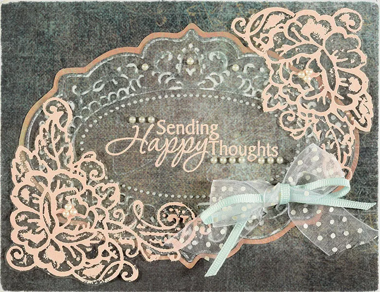 Front: Place the card with the fold at the top. Cover card with chalkboard paper and sand the edges with sandpaper to get a worn look. Following your embossing machine manufacturer’s instructions, emboss the same paper in the Label with Dots embossing folder. Sand the raised design lightly to bring out the design. Cut out around the label shape. Stamp "Sending Happy Thoughts” onto the center of the label. Cover with Zing! Blush embossing powder, tap off the excess and set with a heat gun. Mat the label on pink textured paper, leaving a 1/8" border. Glue to the center of the card.
