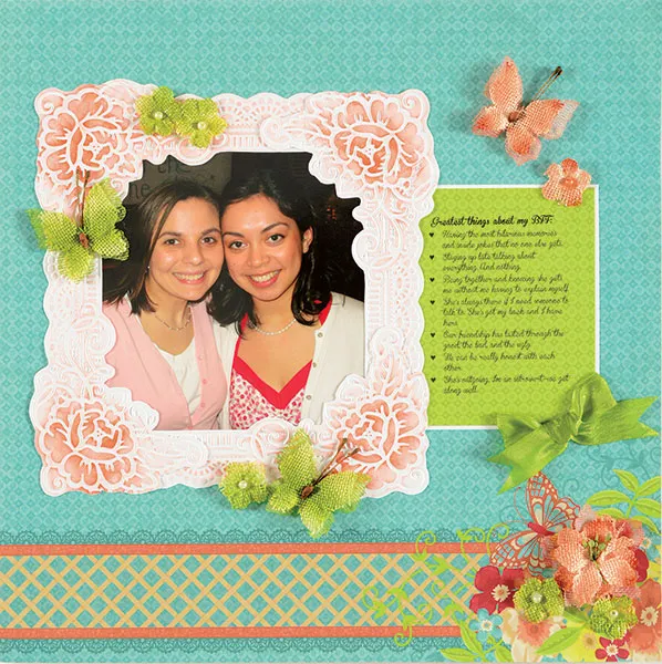 Embellishing: Emboss four pieces of white cardstock with the Rose Corner folder following your machine manufacturer’s instructions. Cut out around the rose and border on each. Using a cosmetic sponge, softly swipe Ripe Persimmon ink onto each rose, going a bit heavier on the rose, and lighter along the border and swirls. Glue the borders along each side of the photo as shown, in a clockwise order, tucking in the last border under the first rose. Glue the burlap butterflies and flowers onto the page as shown. Glue a bow of green crepe ribbon to the lower right corner of the journaling.