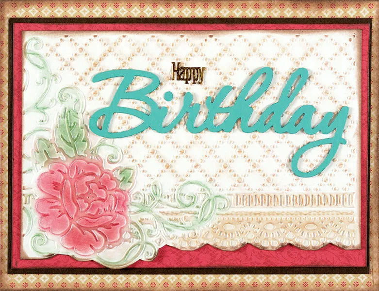 Card front: Place the card fold at the top and cover the card with Pretty Little Posies tan check paper. Ink edges brown. Ink edges of 6”x4 1/2” red floral paper with brown cardstock, leaving 1/8” border and glue to the card center. Emboss white cardstock with the Rose Corner Embossing Folder following your machine manufacturer’s instructions. Cut away the bottom edge along the lace and rose. Apply red chalk to the rose, green on the leaves and vines and brown on the lace edge. Use the chalk set applicator to apply brown chalk along the diamond embossed pattern. Ink the cardstock edges and glue to the card front. Die cut Happy Birthday Cutting Die “Birthday” from aqua cardstock and glue to the card front as shown. Apply Timber Brown StazOn® ink to the “Happy” Gold Tiny Words & Phrases Dazzles™ to darken, and place on the card as shown.