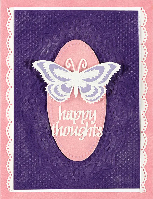 Card Front: Place the card with the fold on the left and cover with Azalea Suede paper. Emboss Iris Suede paper with the Label With Dots Embossing Folder following your machine manufacturer’s instructions. Cut to 4”x5¾” and mat with white cardstock, leaving 1/8” border. Use fingertips to lightly apply white chalk to the embossed image. Glue to the center of the card and place lengths of Lacy Butterfly Dazzles™ borders down the left and right sides of the white mat. Emboss the center of the Label With Dots Embossing Folder onto Azalea Suede paper and cut out the center oval. Apply purple chalk to the embossed dot border on the oval. Glue to the center of the Iris embossed image. Place Lacy Butterfly Dazzles™ “Happy Thoughts” at the bottom of the oval. Place a large butterfly on Princess lavender cardstock and carefully trim around the Dazzles™ edge. Glue the body above the greeting and place foam tape under the wings.