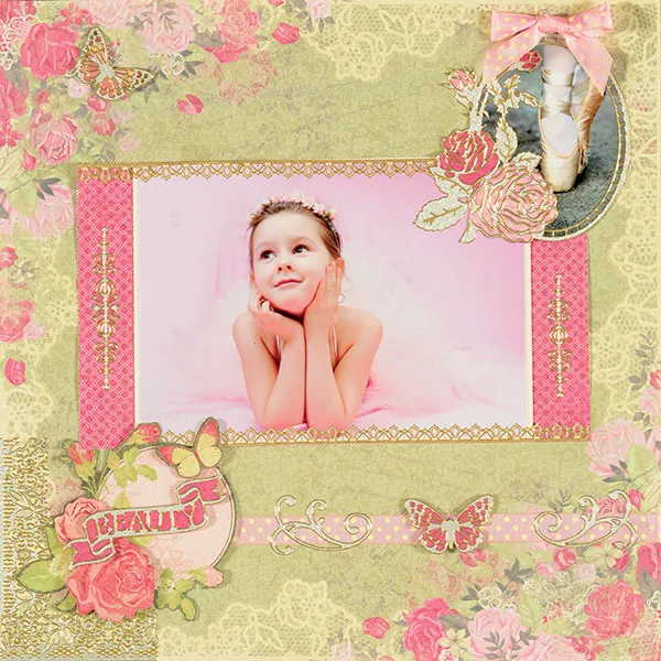 Use the Roses & Lace border paper as your base. Mat a 7”x5” photo on cream cardstock with 1/16” borders. Mat again on Roses & Lace dark pink paper with 1” borders on the right and left. Glue centered 3” from the top. Glue a 9” pink with white polka dot ribbon 2” from the bottom. Place a 3” section from one of the large border Dazzles™ on the bottom left corner. Place the remaining 3” along the left edge.