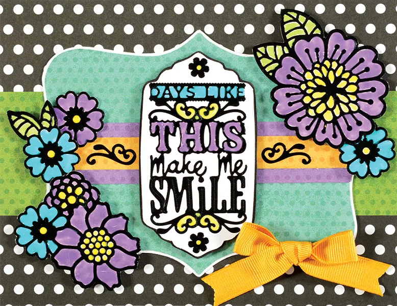 Cover the card front with black/white dots paper then glue a wide strip of green dots paper centered across the black/white dots paper. Use the Design Tool Bracket Label template to trace the shape onto aqua dots paper. Cut it out. Cut strips of purple and yellow paper layer together and glue centered across the label. Mat on white cardstock and glue it centered on the card. Place Dazzles™ greeting on white cardstock and trace the Beveled Label shape around the words. Cut out the shape and mat on black. Foam tape it centered on the card. Add a small flower at the top and bottom of the words.