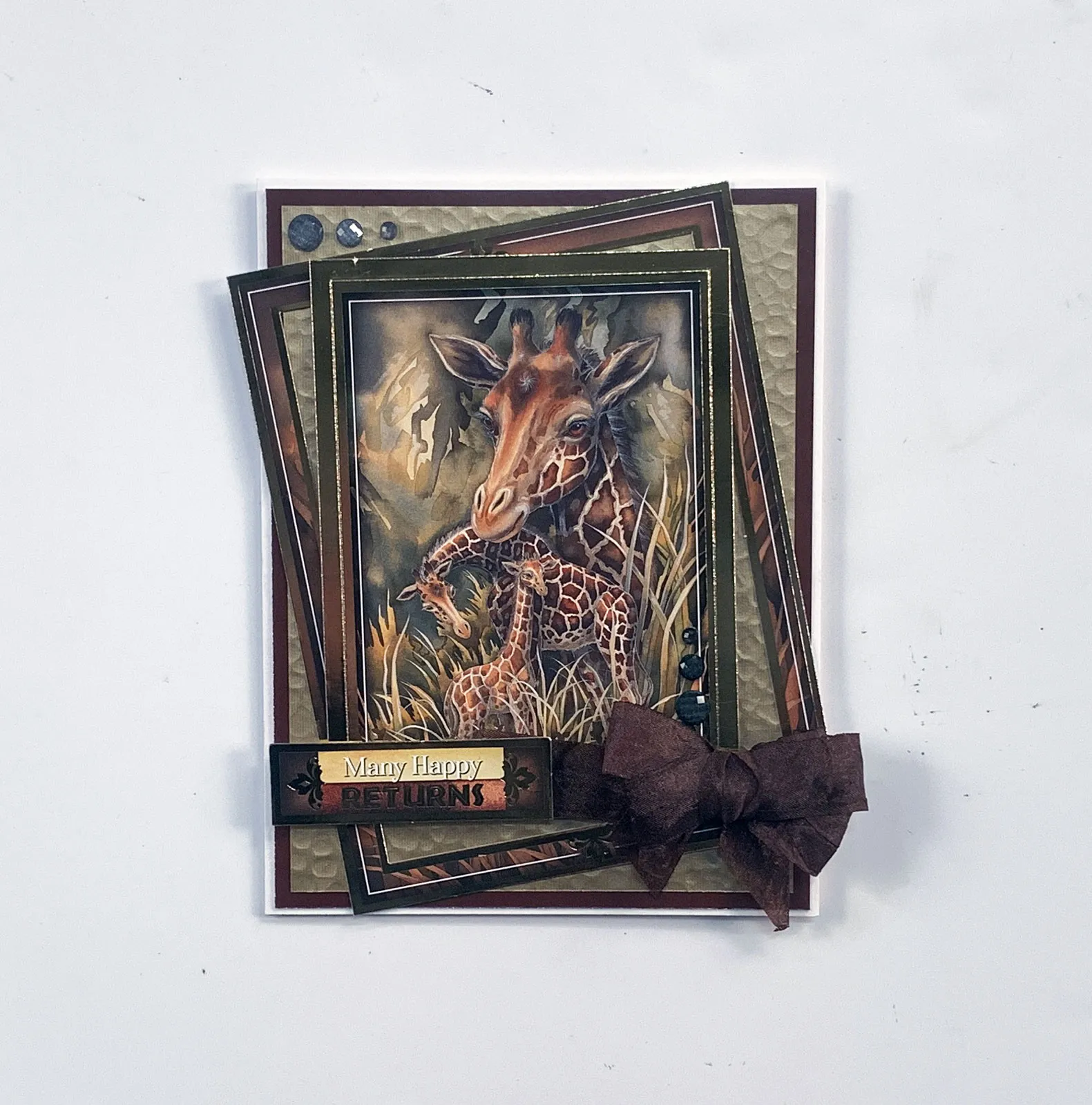 Cut 4 1/2”x6” of Hammered Gold and mat on brown Adorable Scorable with 1/8” borders. Glue to the card leaving a 1/8” white border. Separate the largest giraffe frame and glue offset on the card. Foam tape the remaining two giraffe Toppers as shown. Foam tape the sentiment at the bottom left. Tuck 1” ribbon length behind the sentiment and Zot™ a 2” bow at the end. Place Diamond Sparkles to the top left of the Hammered Gold paper and to the lower right of the giraffe image.