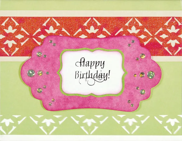 For the inside: Punch a diamond border out of 6 1/2”x1 1/2” of green paper using the same method as the iridescent strip, trimming any excess paper. Mat onto pink texture, leaving 1/4” along the top and bottom. Glue across the top of the card.