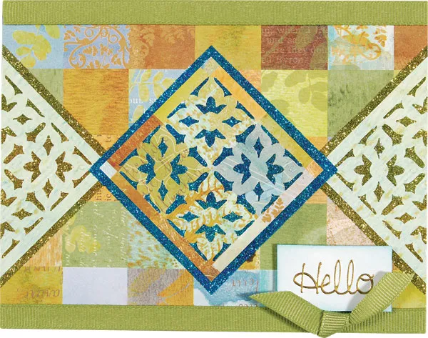 Use Zips™ to glue light green ribbon along the top and bottom of the card. Place “Hello” on a small piece of white cardstock and ink the cardstock with Broken China Distress Ink, using a makeup wedge. Foam tape the greeting to the card, 3/8” from the bottom and 1/2” from the right. Glue a small knot of ribbon at the base of the greeting.