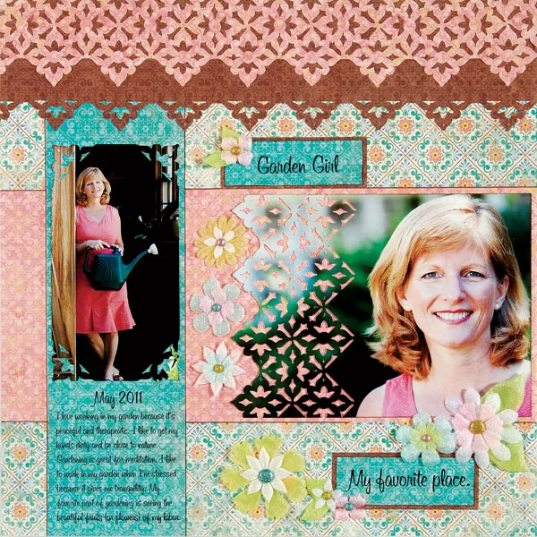 Poke a hole into the top left of the title. Stack a small pink flower onto small leaves and attach through the hole with a glitter mini brad. Create flowers stacking small flowers onto medium flowers. Space them evenly on the pink tile area between the 2 photos and attach with mini brads. Add 2 stacked flowers with leaves at the bottom right of the photo, using small and a medium glitter brads. Attach 3 more flowers to the left of the bottom caption as shown.