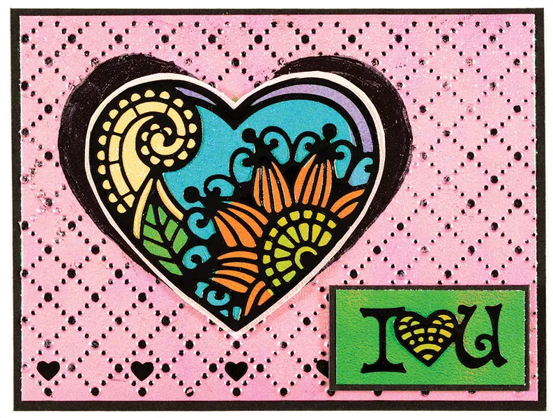 Back the heart part of the “I love U” Dazzles™ with yellow iridescent paper. Cut close to the Dazzles™ edge. Place on a 2”x1” green iridescent paper. Mat on black cardstock with 1/18” borders. Foam tape on the bottom right corner. Place small heart Dazzles™ in the diamond squares along the bottom.