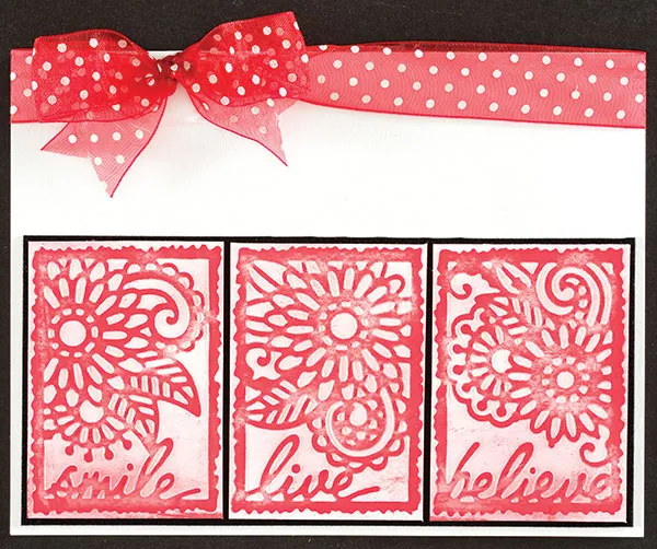 Card front: Place a blank card with the fold on top and tie a length of red w/white dots sheer ribbon around the fold, as shown.