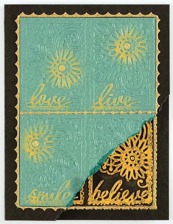 Use your die-cutting machine to emboss 4 ¼”x6” glimmer paper, then cut close to the outer frames. Remove a dollop of Inka-Gold from the container and place on scrap paper. Use your fingertip to lightly rub Inka-Gold onto the raised embossed areas of the large flower centers and the words of each embossed block, as shown. Glue the piece centered on your card. Tear the bottom right corner off of the card front, starting 3” down from the top right corner and ending 1 ½” from the bottom left corner. Surround the edges with border Dazzles™ and place Jewel Dazzles™ on the flower centers, as shown.