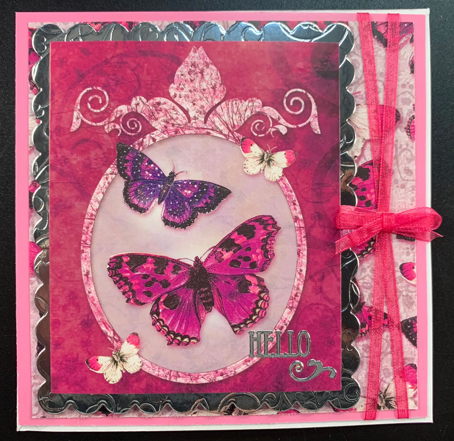 Cut 4 ½” square of butterfly paper. Mat on 4 7/8” square of pink Adorable Scorable. Die cut swirls Debossed Mirri with the large scallop rectangle die. Glue 3 3/8”x4” butterfly focal from the pad in the center. Foam tape to the left side of butterfly the paper. Wrap ribbon twice around the right edge crisscrossing in the center and Zot ™ a 1” bow at the center. Glue only the bottom right section to the white card front piece allowing a narrow white border to frame the piece. Add Dazzles™ greeting