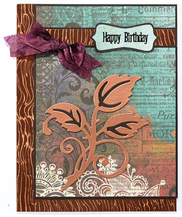 Ink the large vine with leaves and 2 small leaf “innies” with VersaMark ink. Sprinkle with copper embossing powder, tap off the excess, and heat to emboss with the heat gun. Glue the coordinating black leaves beneath the embossed die cut. Set aside the embossed “innies” for the inside. Glue the embossed die cut on the card front as shown.
