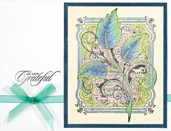 Stamp the large leaf panel onto 3 ½”x4 ½” watercolor paper with black StazOn® ink. Paint the image, blending with a wet brush, as shown. Let dry. Mat on Glimmer paper with a 1/8” border and glue in place on the right.