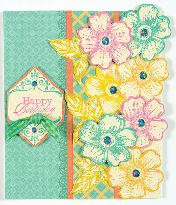 Use both single blossom stamps to stamp two each of the following colors : Picked Raspberries, Peacock Feathers, Spiced Marmalade, and Mustard Seed. Stamp on Pretty Little Posies cream paper. Use the coordinating cutting die to cut out the six blossoms. Use one of the leaves stamps three times with Crushed Olive on Pretty Little Posies cream paper. Use the cutting die to cut. Glue and foam tape the flowers and leaves along the right.