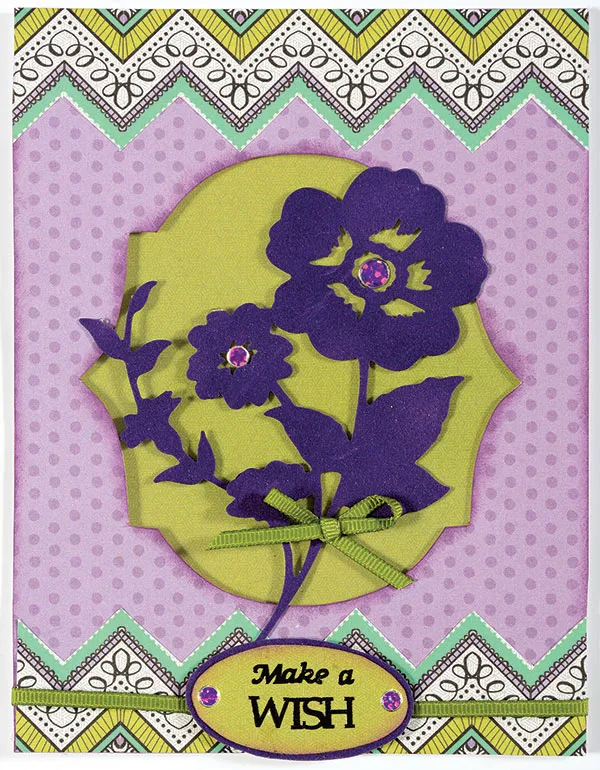Card front: Place a blank card with the fold on your left. Cover with Simply Susan purple dot paper. Ink the edges. Trace Patsy #2 on the inside of the card front, and cut through the front only. Ink the edges. Glue a 4¾”x6¼” clear acetate behind the window. Glue a 5”x1¼” Simply Susan chevron paper on the top and bottom. Glue a 5” green ribbon 3/8” from the bottom.