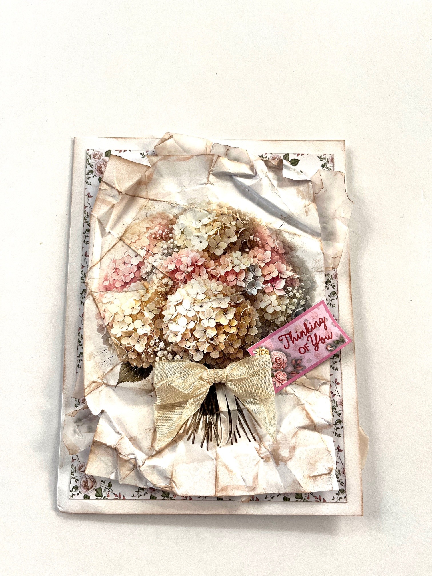 Select a blank white card and orient it with the fold on the left. Place on the craft mat and use a blender brush with velvet fawn ink pad to go over all front edges and inside card base edges. Tape a 4 1/2”x6” Perfect Little Prints Patterned Cardstock to the front leaving 1/4” white edges. Cut 4”x5 3/4” pieces of vellum and the hydrangea bouquet page. Crunch and distress both then go over with Velvet Fawn ink pad to accentuate the creases and tears. Tape vellum at an angle. Foam tape the hydrangea bouquet leaving a 1/2” border all around. Make and Zot™️ a 2” wide cream bow from the Crepe Ribbon Set and secure over the bouquet stems. Tuck “Thinking of you” cut- out sentiment behind bow.