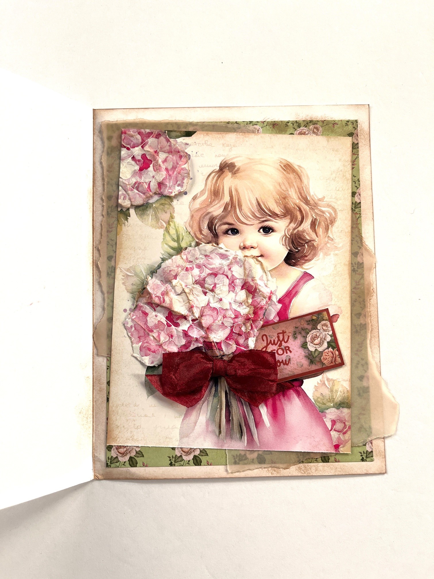 Inside: Cut 4 1/2”x6” piece of green Perfect Little Prints cardstock and tape leaving ¼” card borders. Tear and ink a 4”x5 3/4” vellum and tape to cardstock at an angle. Select the little girl Little Book page and trim 1/4” off the bottom. Ink Little Book page and tape to Patterned cardstock at an angle. From another identical sheet tear out the hydrangeas and again crumple then ink. Place Zots™️ in the centers and attach over the originals. Make and Zot™️ a 2” wide red bow from the Crepe Ribbon Set and place on the stems of the bouquet. Tuck “Just For You” cutout into right side of the bow.