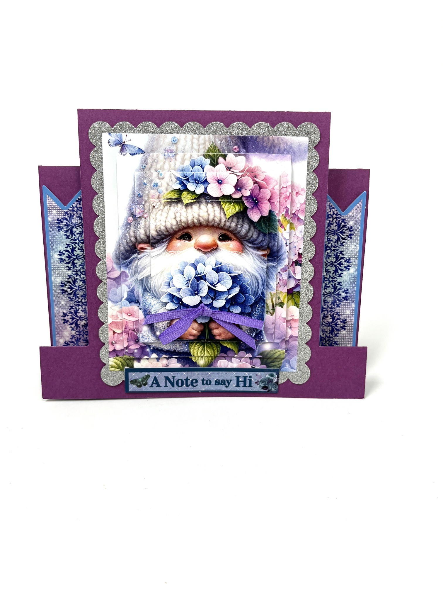 Use the rectangle straight sided dies to cut 4 gnome pages from the Little Book of Hydrangeas starting with the 3 1/2” wide die for the base gnome layer which is taped to the silver glitter cardstock. Then foam tape 3 3/8” wide rectangle over the base layer matching the gnome images. Repeat foam taping the 2 3/4” die, 2 1/4” die and the 2” wide die matching up the images.