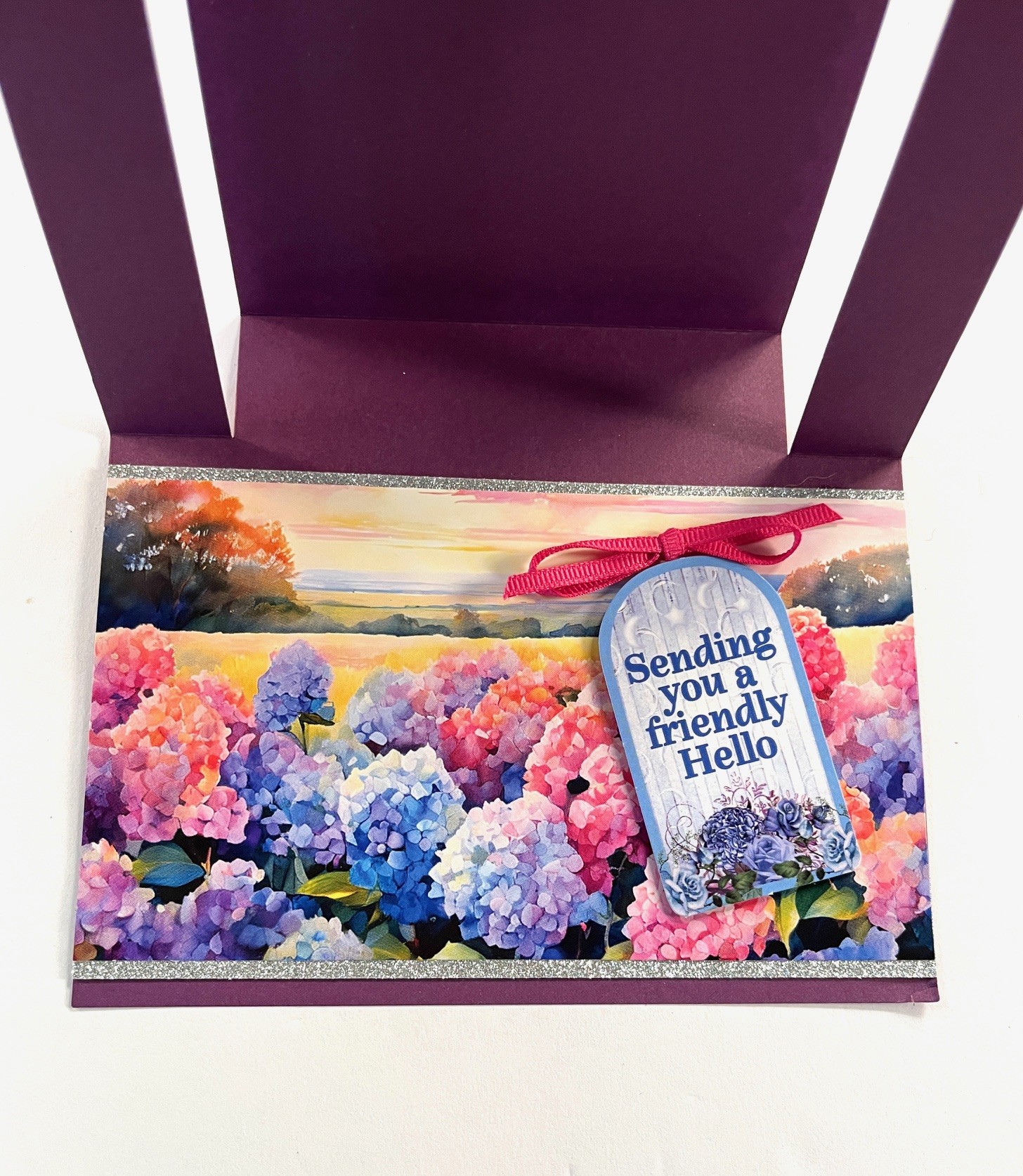 Card inside: Cut the scene Hydrangea Little Book Page to 5 7/8”x 3 1/4”. Mat on silver glitter cardstock with 1/8” top and bottom borders. Tape to the inside. Foam tape the “Sending you a friendly Hello” die-cut on the right as shown. Make and Zot™️ a 2” wide pink bow from the 1/8” Ribbon Set above the tag.