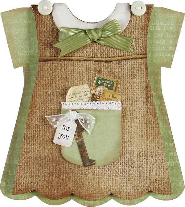 Cover a pocket with solid green paper and chalk the edges brown. Glue a length of white lace to extend from the back, top edge of the pocket. Glue a portion of a letter (roll the edge) and baking cut-outs to extend from behind the pocket. Glue the pocket to the center of the apron. Cut out the key and write on the small punched tag with chalked edges. Glue to the top edge of the pocket and top with a knotted length of sheer dot ribbon.