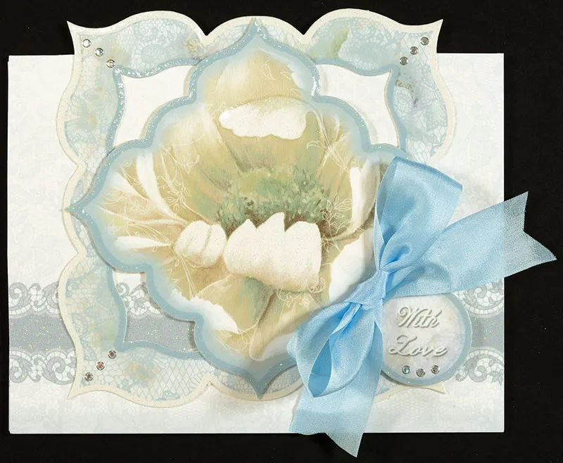 Front: Place the card fold on the top and cover with Hunkydory Frosted Florals blue and silver magnolia cardstock, placing the border along the bottom of the card. From the Frosted Blooms die-cut sheet, glue the large lace frame on the card, extending ½” above the fold.