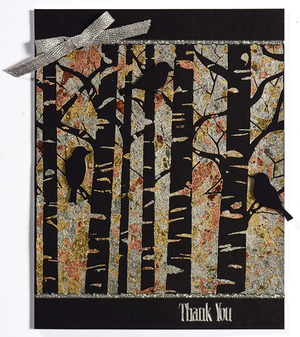 Tape the edges of the Birch Tree stencil in place on black cardstock. Use a cosmetic sponge to apply FlitterGlu into the open spaces of the stencil, onto the cardstock. Remove the stencil and wash it. Sprinkle Manchester Tart Mega Flake onto the glue image and lightly press in place. Use the Scoochy foam to polish the image.