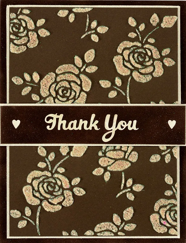 Tape the stencil in place on brown cardstock. Use the squeegee to apply the cement paste over the open spaces of the stencil, taking your time to cover all the spaces in an even layer. Lift the stencil and wash/dry it. Let the stenciled design dry a few minutes, then sprinkle with crystal micro glitter. Tap off the excess glitter. Cut a 2 1/2"x1 3/4" brown cardstock and stencil a single rose with leaves with paste and glitter as before. Set the pieces aside to dry completely.