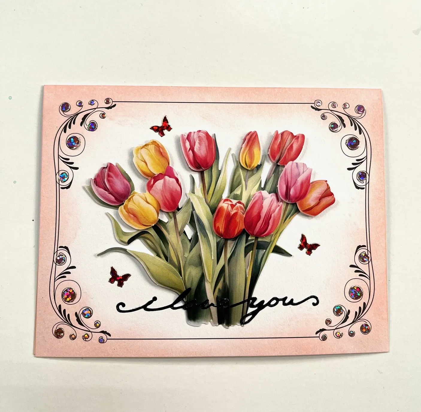 2. Glue the largest tulip Die-Cut in the card center. Use foam tape to attach the other pieces over their matching art. Place “I love you” from the 500 Script Greetings Dazzles™ over the flower stems.