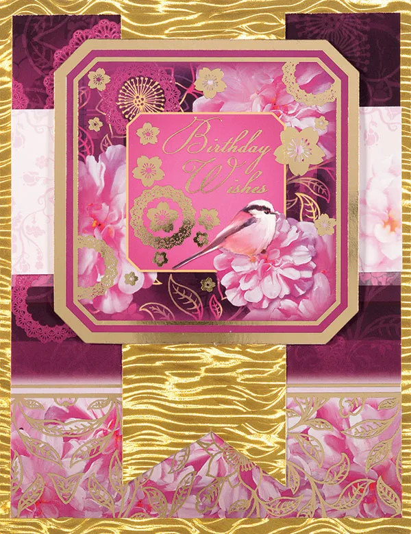 Card Front: Place a card with fold on the left. Cover with Gold Ripple paper. Glue 4¾"x6¼” Eastern Promise burgundy foiled cardstock centered. Glue 4¾"x2” Eastern Promise pink flower cardstock centered, 3 1/4" from the bottom. Cut 2”x5¾" Gold Ripple paper and cut a “V” from one end. Glue centered, 1/8” from the top. Foam tape the “Birthday Wishes” frame centered.