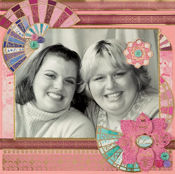 Before gluing a 10”x8” photo, arrange and tuck Eastern Promise fans behind and on top of the photo as shown in the sample. Glue the pieces in place. Zot™ the Eastern Promise pink lotus flower together and glue it to the bottom right corner of the photo. Foam tape the “Love” sentiment to the center of the flower. Place Gold Jewel Border Dazzles™ around the photo. Glue a flower to the photo and Zot™ a mint green button in the center. Zot™ pink, lavender and mint green buttons to the top left corner of the photo and the bottom right corner as shown.