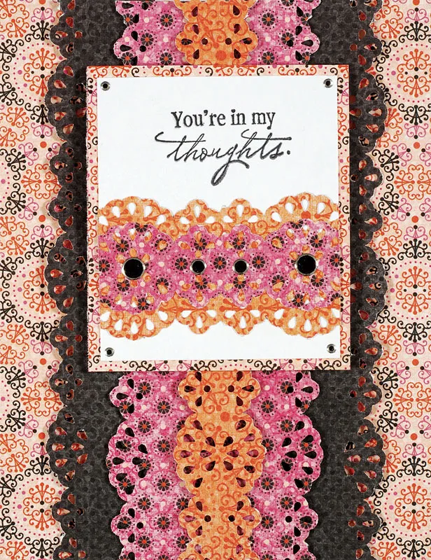 Cut a 4”x6 1/2” Grapefruit black paper and punch along the long edges with the Doily punch on the first setting. Foam tape to the center of the card. Cut a 2 1/2”x6 1/2” Grapefruit hot pink paper and punch along the long edges with the Doily punch on the first setting. Foam tape to the center of the card. With the Doily punch on the second setting, punch a 6 1/2” long Grapefruit orange paper and foam tape to the center of the card.