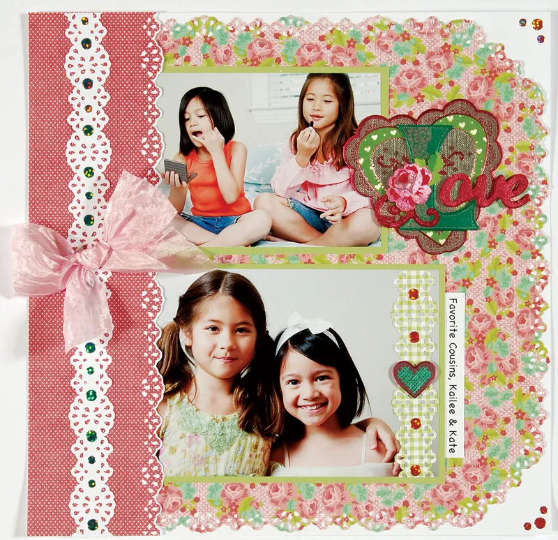 Punch 2 Edge punch on Penelope lime green gingham paper and glue down the right side of 5”x7” photo. Decorate the border with large Pink Jewel Dazzles™. Foam tape a small foil heart as shown. Mat the photo with lime cardstock, leaving 1/8” border. Mat 4”x6” photo with lime cardstock and glue both photos to extend from under the pink dot border. Assemble and glue a foil papier tole heart to the right of the smaller photo. Write or print journal on a 5/8” wide strip of white cardstock and glue to extend from under the right edge of larger photo as shown.