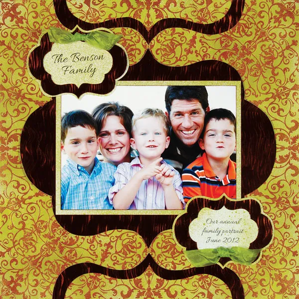 Cut an 8”x10 1/4” Vintage Label from Mocha ripple paper and glue to center of the medallion paper using Zots™ adhesive dots (8 around the edges is fine). Use a cosmetic sponge and dark brown fluid chalk ink to ink the edges of a 7”x5” photo. Mat the photo on the spritzed white cardstock, leaving a 1/4” border. Glue to the center of the Vintage Label. Place the template on the back of the ripple paper and trace the 8”x10 1/4” and the 7”x9” shapes. Cut out the outer line, then cut along the inner line. Trim 1 3/4” off of each of the pointed sides of the shape, creating brackets. Glue one bracket at the top with the point down and one at the bottom with point up.